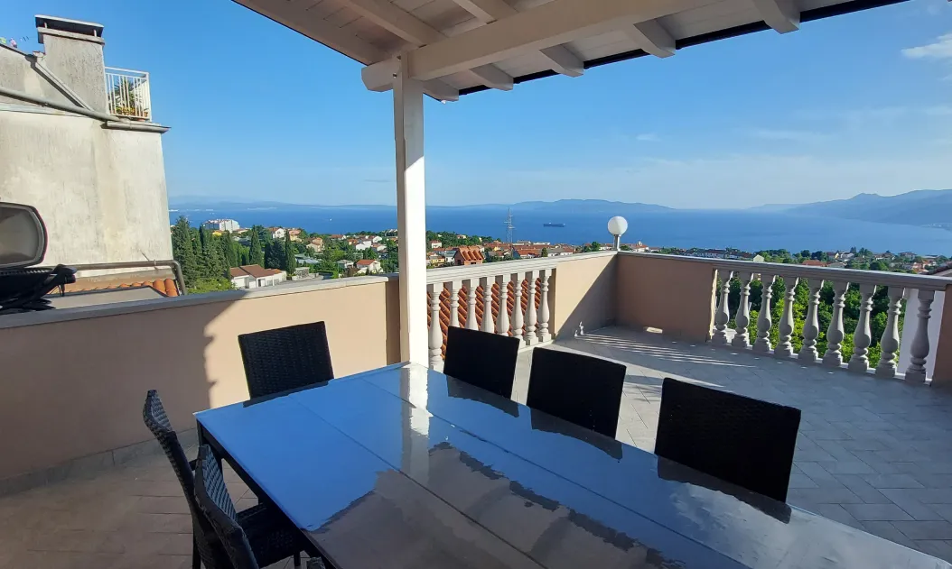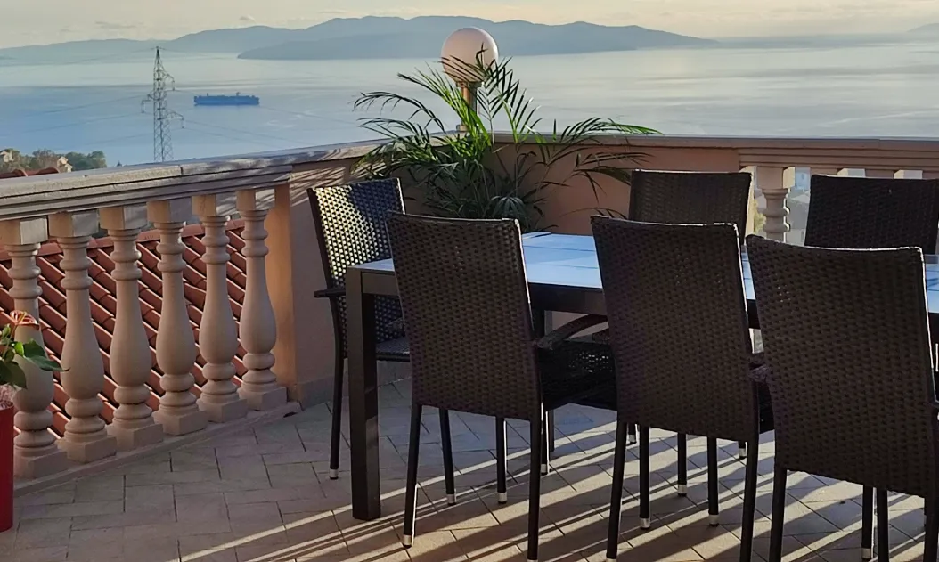 Large shared covered terrace with panoramic sea views, equipped with a grill and a table to accommodate 9 people.